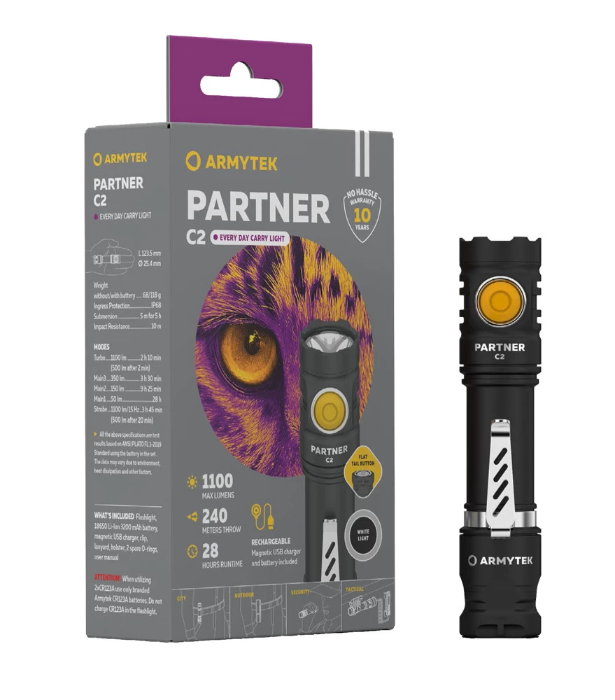 Az Armytek Partner C2 (V4) Magnet USB lámpákat kifejezetten rendvédelmi, katonai, vadászati igényekhez és igénybevételekhez tervezte a gyártó. Ezeknél a termékeknél alapkövetelmény az alacsony súly, a csúszás menetes markolat, a hosszú működési idő és a lámpa végére tervezett taktikai kapcsológomb, amivel a lámpa kesztyűben is biztonságosan használható. A taktikai kapcsológomb opcionálisan távkapcsolóra is cserélhető.
